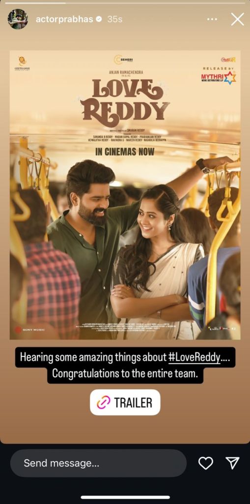 చిన్న చిత్రాలకు తమ వంతు బాధ్యతగా మద్దతు ఇచ్చేందుకు పెద్ద హీరోలు ఎప్పుడు ముందుకొస్తున్నారు. ఈ క్రమంలోనే యంగ్ రెబల్ స్టార్ ప్రభాస్ తన వంతు బాధ్యత పోషించారు.. లవ్ రెడ్డి చిత్రాన్ని ప్రొత్సహిస్తూ ఇన్ స్టా వేదికగా తన మద్దతు ప్రకటించారు. “లవ్ రెడ్డి” చిత్రానికి సంబంధించి ఎన్నో మంచి విషయాలు తన దృష్టికి వచ్చాయని, ఇటీవల కాలంలో విడుదలైన ప్రేమ కథల్లో “లవ్ రెడ్డి” మంచి చిత్రంగా నిలువడం ఆనందంగా ఉందని ప్రభాస్ తెలిపారు. ఈ మేరకు ఇన్ స్టాలో తన అభిమానుల కోసం ‘లవ్ రెడ్డి” ట్రైలర్ ను షేర్ చేస్తూ ఆ చిత్రానికి అండగా నిలువాలని ప్రభాస్ కోరారు. ఇప్పటికే ఈ చిత్రానికి యువ నటుడు కిరణ్ అబ్బవరం ముందుకొచ్చి తెలుగు రాష్ట్రాల్లో 4 స్పాన్సర్ షోలు వేసి మద్దతు ఇవ్వగా ప్రభాస్ లాంటి అగ్ర హీరో లవ్ రెడ్డి చిత్రానికి అండగా నిలువడం పట్ల చిత్ర బృందం ఆనందం వ్యక్తం చేసింది. ప్రభాస్ “లవ్ రెడ్డి” చిత్రానికి మద్దతుగా నిలువడం పట్ల సామాజిక మాద్యమాల్లో నెటింజన్లు ప్రశంసలు కురిపిస్తున్నారు. “లవ్ రెడ్డి” చిత్రం ఘన విజయం సాధించాలని ఆకాంక్షిస్తున్నారు.